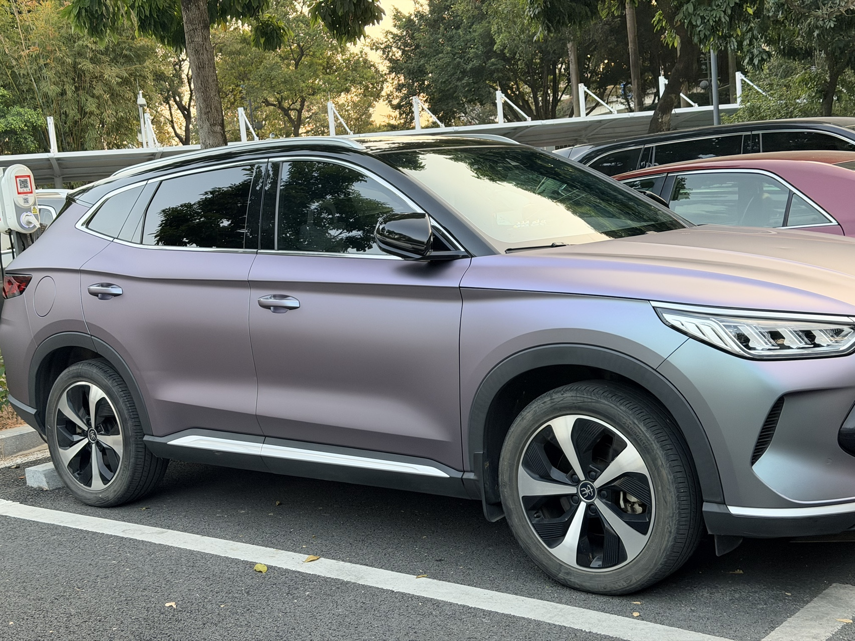 宋 Plus 灰色烂大街,加上车门两侧在停车场被旁边的车开门碰得伤痕累累,一直想改色贴膜。本月月中终于付诸行动,在淘宝下单了一款 TPU 改色膜,选的是卡普里灰紫色,把车送到线下门店贴好了。哑光的卡普里灰紫色,车身随着光线和角度变化,会呈现紫色基础上的渐变效果。
