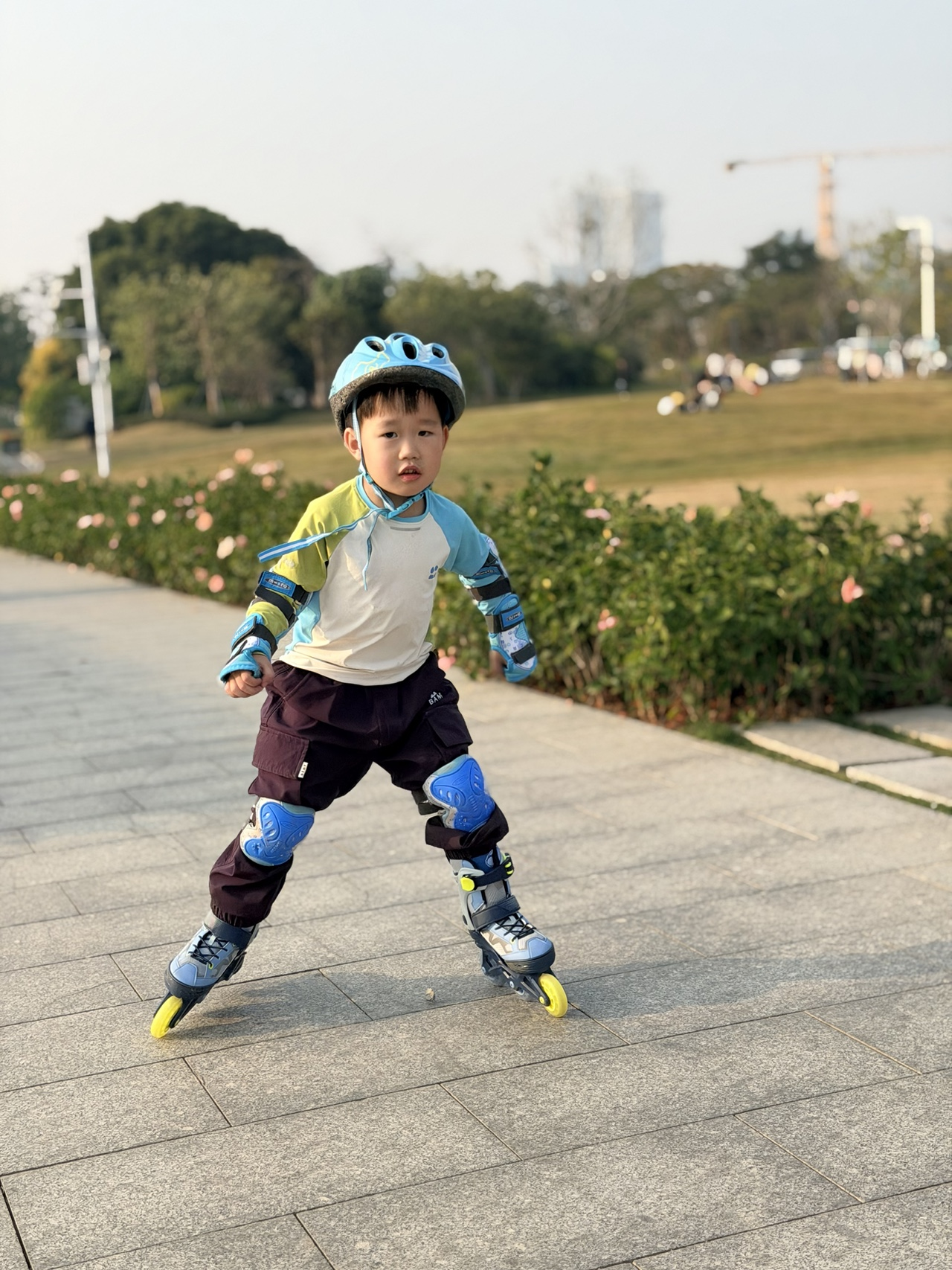 两周前在笔架山公园逛完,中秋和安安、姑姑一起去深业上城吃晚饭,回来时姑姑和安安分别提溜着一双轮滑鞋。没人教,安安这两周自己穿上轮滑鞋,戴好护具,在公园和小区玩得飞起。一周后中秋也买了一双,踉踉跄跄,屁股摔惨了。