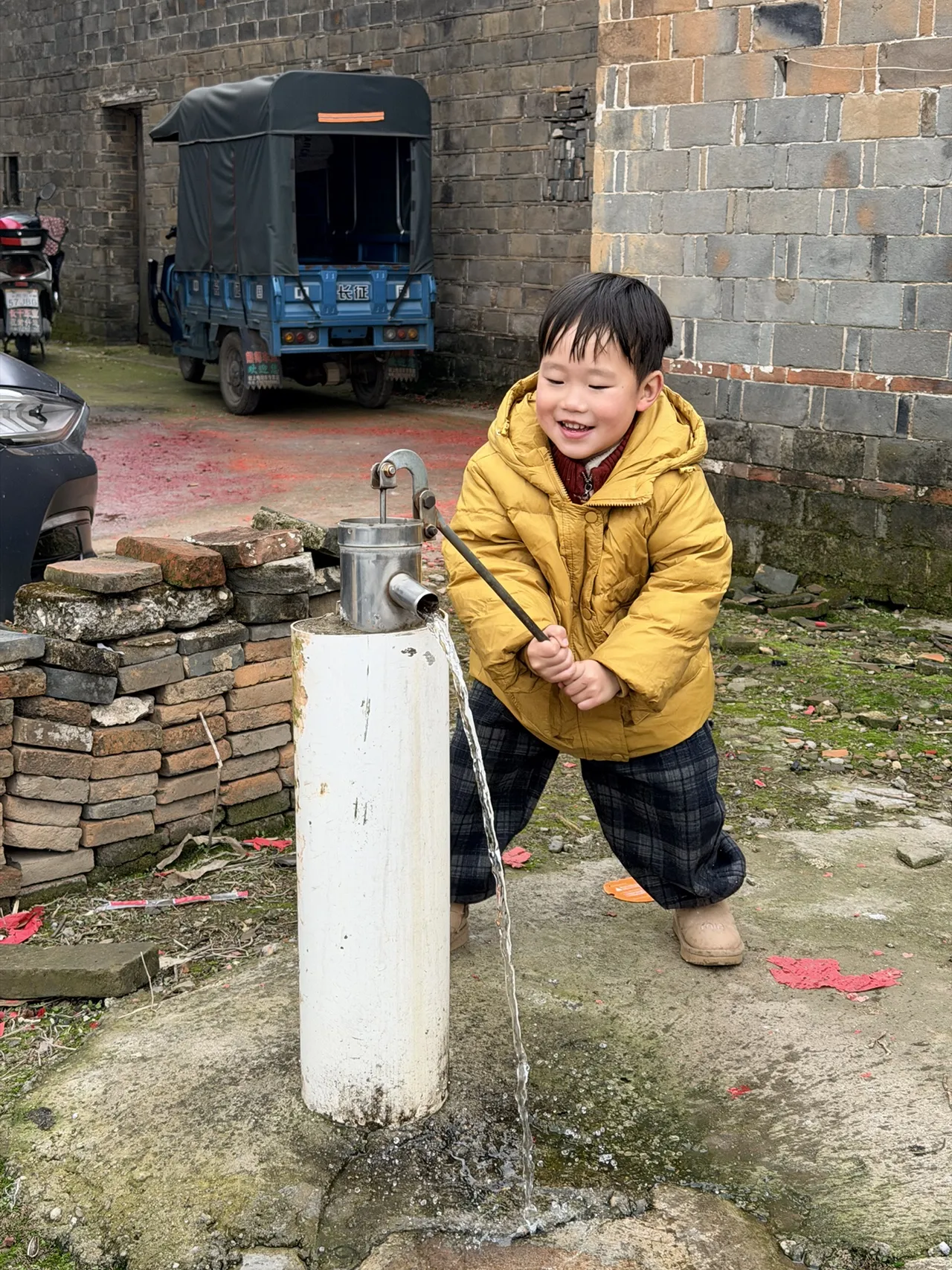 大年初二去拜年,亲戚家旁边有一口压水井。安安在城里没见过,对它很感兴趣,玩得不亦乐乎。
