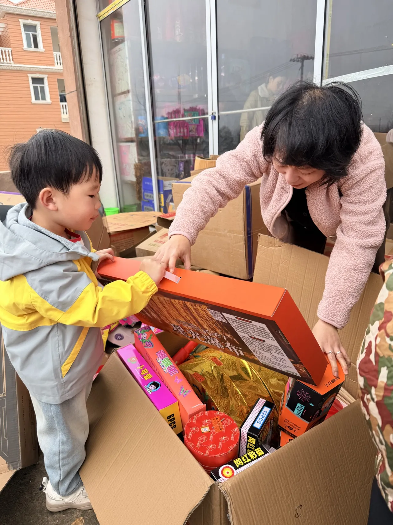 回家第二天依旧到老地方买烟花。臭小子很门清,刚下车走到烟花店门口就知道先找个空箱子,然后拿着空箱子去店里挑选。不一会儿就搞了 1500+,又是两大箱。哪是放烟花呀,是烧钱。